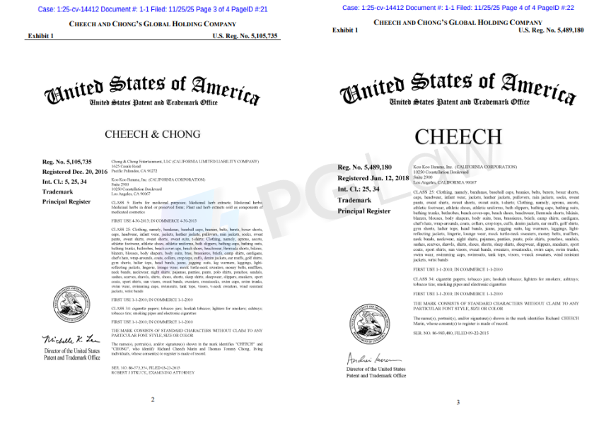| 25/11/2025 | 25-cv-14412 | SULLIVAN & CARTER, LLP | C&C Trademarks | Cheech and Chong’s Global Holding Company |