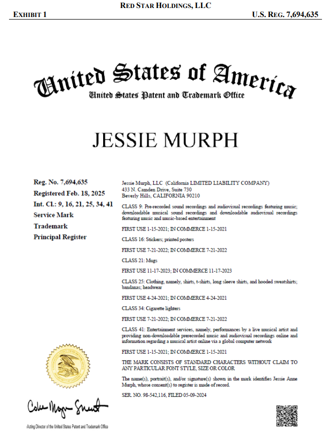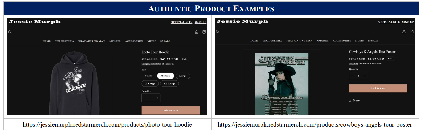 Given her popularity, there is a high demand for Jessie Murph branded merchandise, including clothing (e.g., shirts, t-shirts, hooded sweatshirts, etc.), posters, and miscellaneous goods (the “Jessie Murph Products”) which are distributed and sold to consumers throughout the United States.