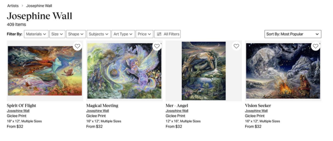 JOSEPHINE WALL, is the owner of the Copyright Registrations that protect the creative content of the Josephine Wall Works. Wall is a painter. Plaintiff’s paintings are mainly fantasies, influenced and inspired by the illustrative talents of Arthur Rackam, the surrealism of artists such as Magritte and Dali, and the romanticism of the pre-Raphaelites, which combined with Plaintiff’s own imaginative ideas has led to a wide and varied range of work. Wall works mostly with acrylic paint, which allows Plaintiff to create many textured and colorful effects. Plaintiff’s work can be found in galleries across Europe and North America, and it has been licensed for use on a variety of products including puzzles, mugs, stationery, gifts, fabrics, totes, crafts, and home goods.