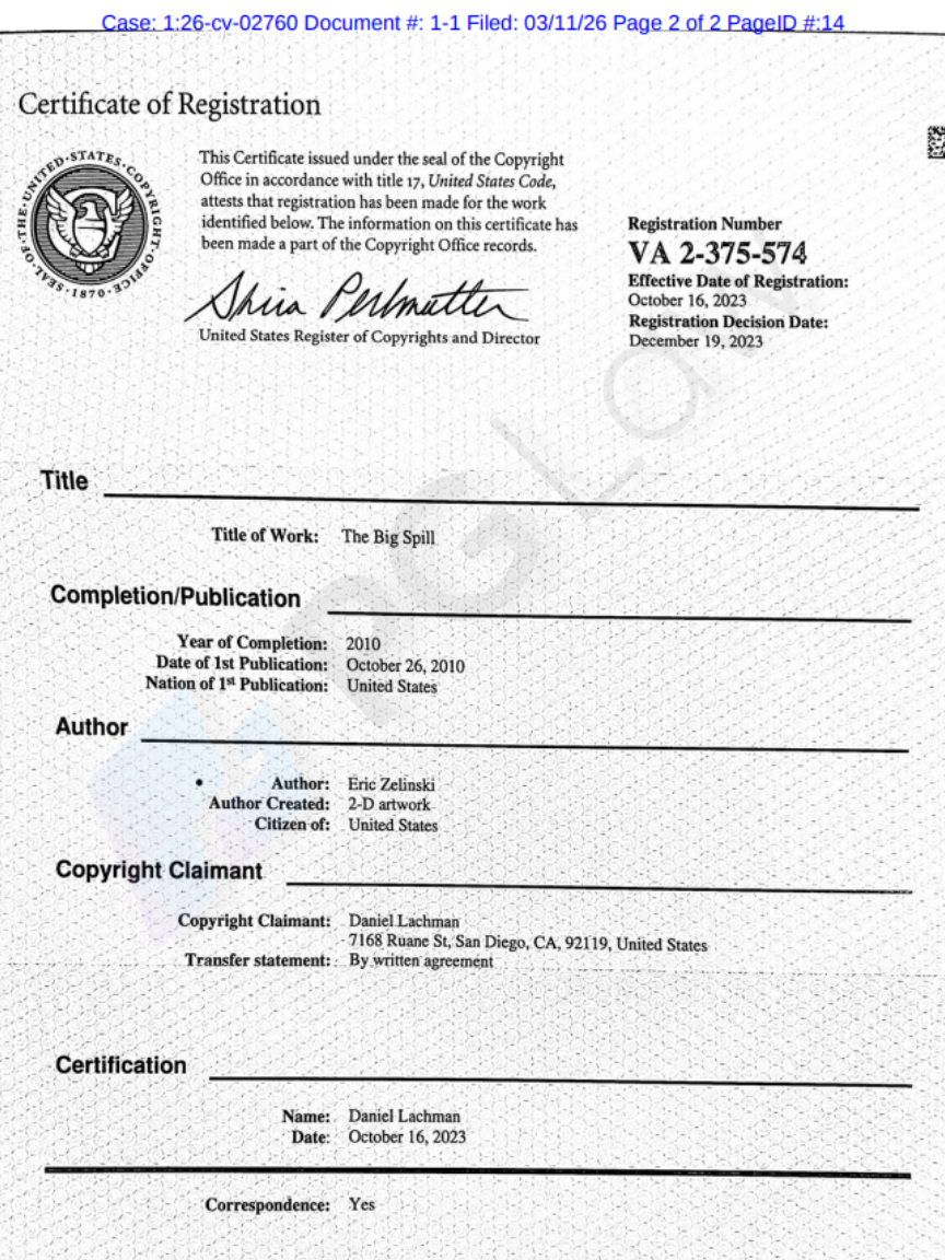 Dan Lachman is the owner of the federal copyright registrations that protect the creative content of Lachman’s licensed images and illustrations. Lachman is a businessman in California and the owner of the Copyright for the “The Big Spill” work.
