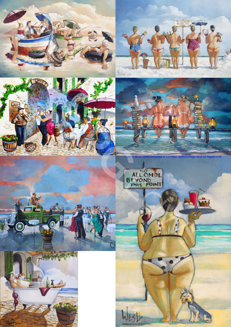 Plaintiff, Ronald Martin West, is the owner of the Copyright Registrations that protect the creative content of the Ronald West Works. West is an oil painter who depicts the Mediterranean lifestyle, often featuring his well-known plump, fun ladies and a black cat. He has always shown a keen interest in art since childhood. In high school he began taking art classes with a focus in sculpture. In 2003, he had a vivid dream which compelled him to buy his first art easel, paint, and accessories and begin painting without any formal experience. Shortly after, West participated in his first solo exhibition. It sold out and he has been represented by numerous local galleries ever since. West’s sources of inspiration are Amadeo Modigliani, Pablo Picasso, Vincent van Gogh, and life as he dreams it.
