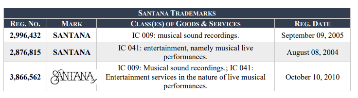 Plaintiff is incorporated in Nevada and located at 11035 Lavender Hill Dr., Suite 160, #426, Las Vegas, Nevada 89135. Santana was formed in 1966 in San Francisco, California, by guitarist, Carlos Santana. The band has sold over forty- seven (47) million albums in the US, and an estimated one hundred (100) million worldwide. In 1998, Santana was inducted into the Rock and Roll Hall of Fame, and in 2000, the band won eight Grammy Awards for hit singles “Smooth” and “Maria, Maria.” Spanning six decades, Santana has been a pioneer for inclusion of Latin music into the mainstream and remains beloved by fans of every generation around the world.