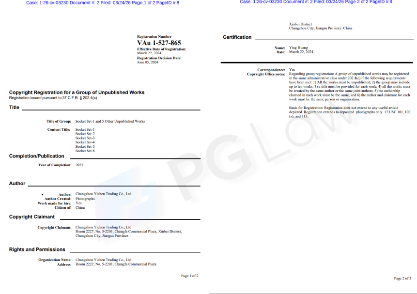 24/03/2026 26-cv-03230 Qin Zhuang Socket Set Photographs Changzhou Yichen Trading Co., Ltd